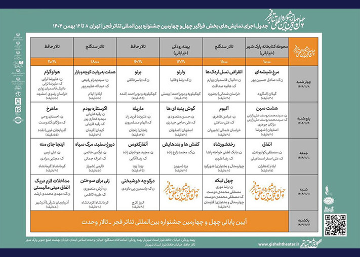 جدول اجراهای بخش فراگیر چهل و چهارمین جشنواره تئاتر فجر را می توانید از اینجا دانلود کنید.